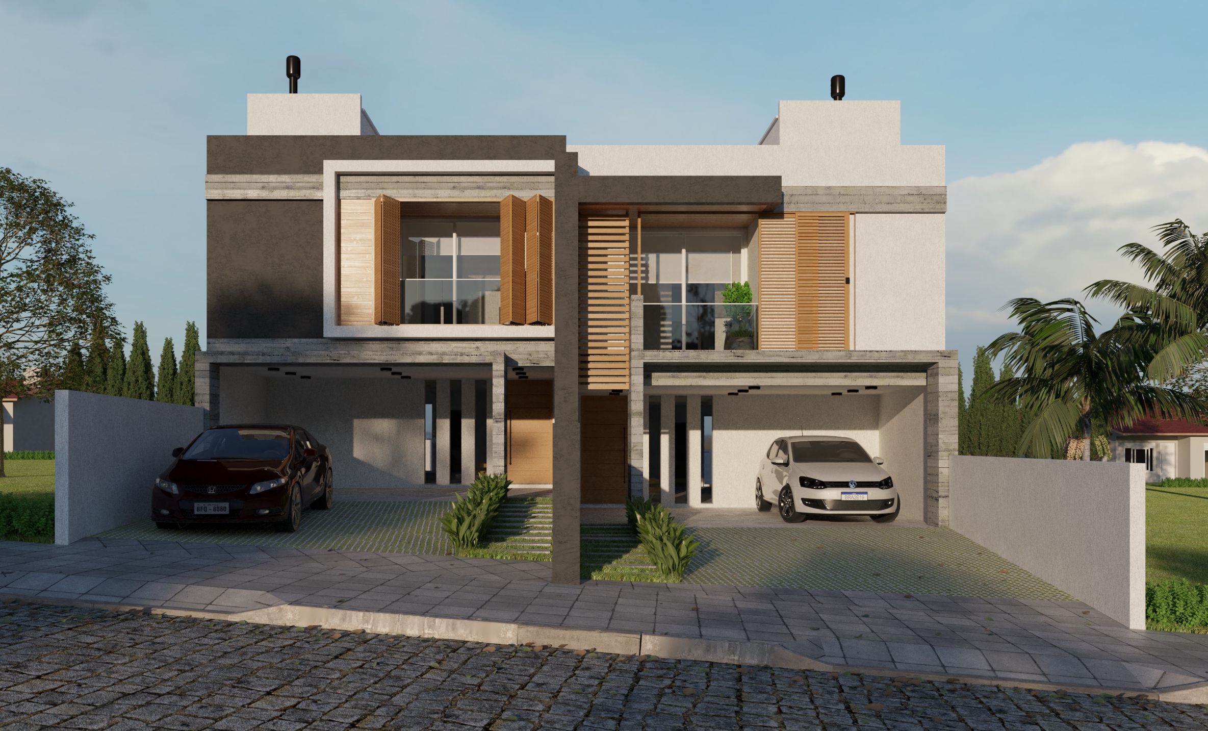 Projeto desenvolvido em parceria com o Construtor, tomando como base um terreno irregular, em forma de cunha e com face mais estreita junto ao alinhamento, foi desenvolvido o projeto de 2 casas de plantas espelhadas. Na frente acessos, garagens e suíte do casal, ao fundo áreas de permanência diurna, dormitórios e amplo quintal.